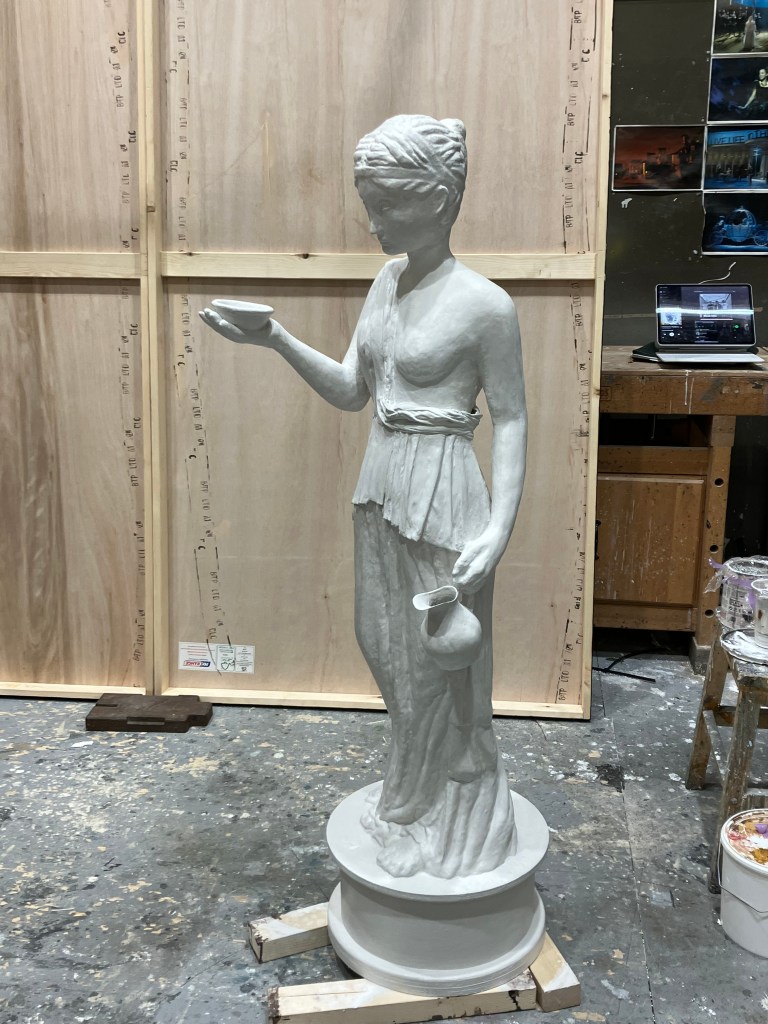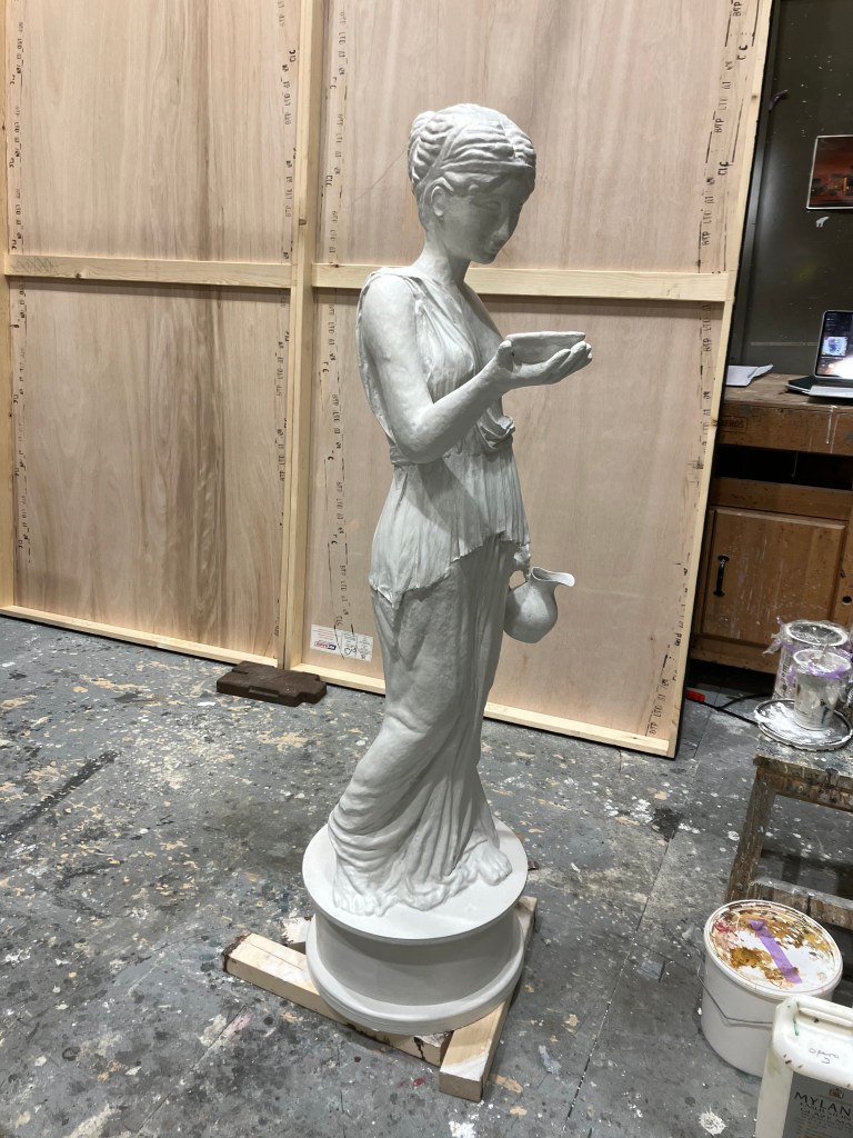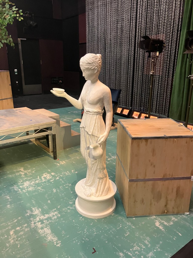 Carved statue of the goddess Hebe for Spring Opera Scenes (2025). Designed by Helen Hebert for Milton Court Studio Theatre (GSMD). Photography by David Monteith-Hodge.